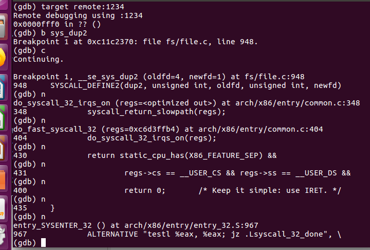 gdb vmlinux (gdb) target remote:1234 (gdb) b sys_dup2