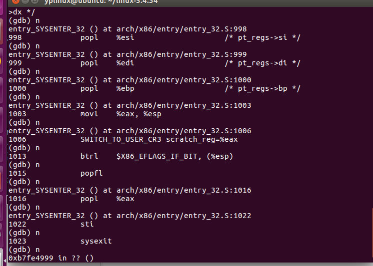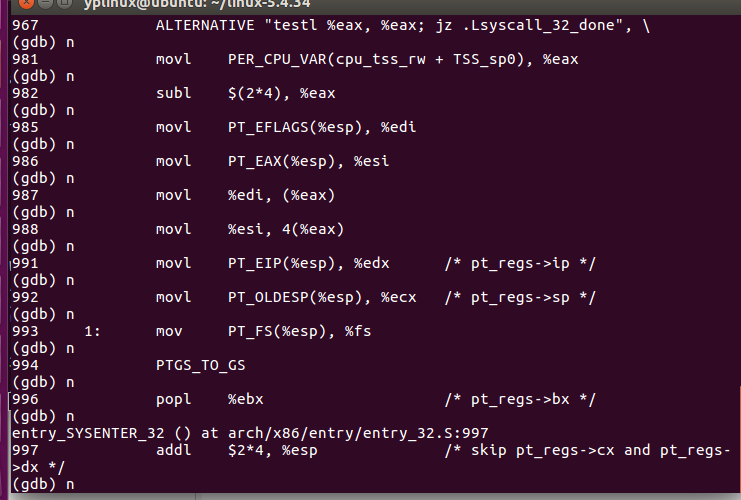 通过以上gdb调试,entry_sysenter_332()是整个系统调用的入口处,它负责保存现场,调用对应的内核处理函数,并恢复现场,完成系统调用的返回等一系列工作。并且它的保存现场主要是通过swapgs和压栈完成的。