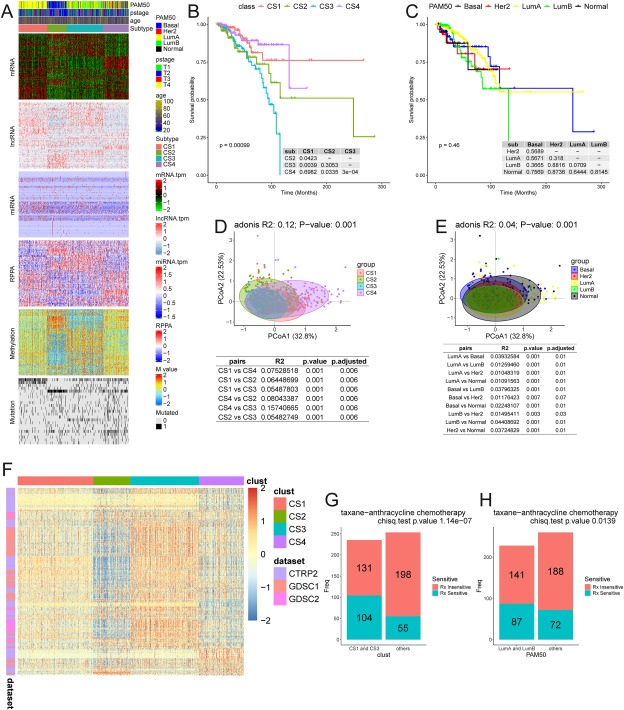 We classified the BC samples collected from TCGA databases using the clustering function of the R package MOVICS, consisting of ten clustering methods: iClusterBayes, SNF, PINSPlus, NEMO, COCA, LRAcluster, ConsensusClustering, IntNMF, CIMLR, and MoCluster, based on co-expressions of metabolic genes (Supplementary Methods; Table S1) plus additional omics data such as genomic, proteomic, and methylomic data. This led to four distinct classes: CS1, CS2, CS3, and CS4 (Fig. 1A)- 数据 :使用TCGA数据库的乳腺癌多组学数据(基因表达、基因组变异、甲基化、蛋白组)。
