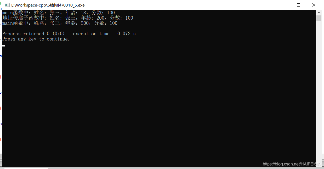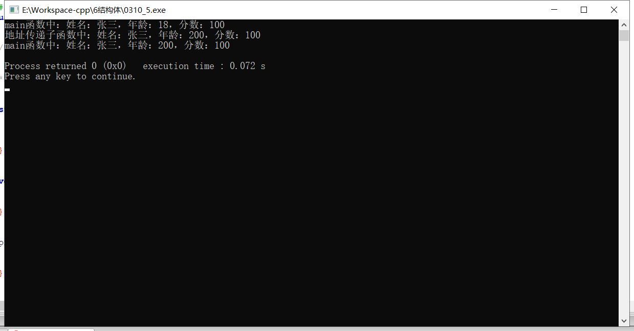 cout << "值传递子函数中:姓名:" << s.name << ",年龄:" << s.age << ",分数:" << s.score << endl;