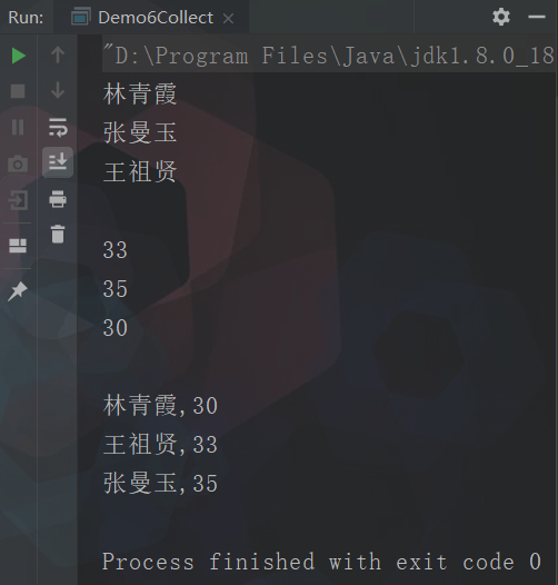 1 package day14.lesson2; 2 3 import java.util.*; 4 import java.util.stream.Collectors; 5 import java.util.stream.Stream; 6 7 /* 8 2.6 Stream流的收集操作 9 10 对数据使用Stream流的方式操作完毕后,可以把流中的数据收集到集合中 11 12 Stream流的收集方法 13 R collect(Collector collector) 把结果收集到集合中,参数是一个Collector接口 14 15 工具类Collectors提供的具体的收集方式 16 public static Collector toList() 把元素收集到List集合中 17 public static Collector toSet() 把元素收集到Set集合中 18 public static Collector toMap(Function keyMapper,Function valueMapper) 把元素收集到Map集合中 19 */ 20 public class Demo6Collect { 21 public static void main(String[] args) { 22 ArrayList<String> list = new ArrayList<>(); 23 list.add("林青霞"); 24 list.add("张曼玉"); 25 list.add("王祖贤"); 26 list.add("柳岩"); 27 28 //需求1:获取长度为3的元素,组成一个流 29 Stream<String> listStream = list.stream().filter(s -> s.length() == 3); 30 //需求2:把使用Stream流操作完毕的数据收集到list集合中,并遍历 31 List<String> names = listStream.collect(Collectors.toList()); 32 for (String name: names){ 33 System.out.println(name); 34 } 35 System.out.println(); 36 37 Set<Integer> set = new HashSet<>(); 38 set.add(10); 39 set.add(20); 40 set.add(30); 41 set.add(33); 42 set.add(35); 43 44 //需求3:获取年龄大于25的元素,组成一个流 45 Stream<Integer> setStream = set.stream().filter(s -> s > 25); 46 //需求4:把使用Stream流操作完毕的数据收集到set集合中,并遍历 47 Set<Integer> ages = setStream.collect(Collectors.toSet()); 48 for (Integer age: ages){ 49 System.out.println(age); 50 } 51 System.out.println(); 52 53 String[] strArray = {"林青霞,30", "张曼玉,35", "王祖贤,33", "柳岩,25"}; 54 55 //需求5:获取数组中年龄大于28的元素,组成一个流 56 Stream<String> arrayStream = Stream.of(strArray).filter(s -> Integer.parseInt(s.split(",")[1]) > 28); 57 //需求6:把使用Stream流操作完毕的数据收集到Map集合中,并遍历;要求:姓名作为键、年龄作为值 58 Map<String, Integer> map = arrayStream.collect(Collectors.toMap( 59 s -> s.split(",")[0], 60 s -> Integer.parseInt(s.split(",")[1]) 61 )); 62 Set<String> keySet = map.keySet(); 63 for (String key: keySet){ 64 Integer value = map.get(key); 65 System.out.println(key + "," + value); 66 } 67 68 } 69 }