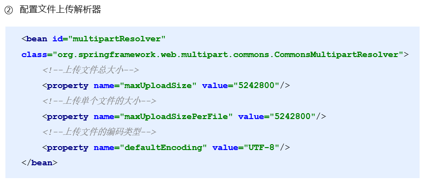 1 spring-mvc.xml 2 3 + 4 5 <!--配置文件上传解析器--> 6 <bean id="multipartResolver" class="org.springframework.web.multipart.commons.CommonsMultipartResolver"> 7 <property name="defaultEncoding" value="UYF-8"/> 8 <property name="maxUploadSize" value="500000"/> 9 </bean>