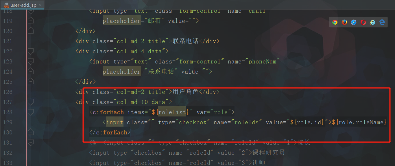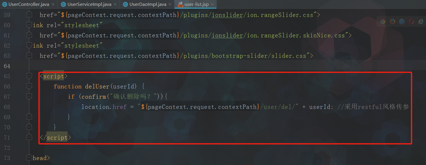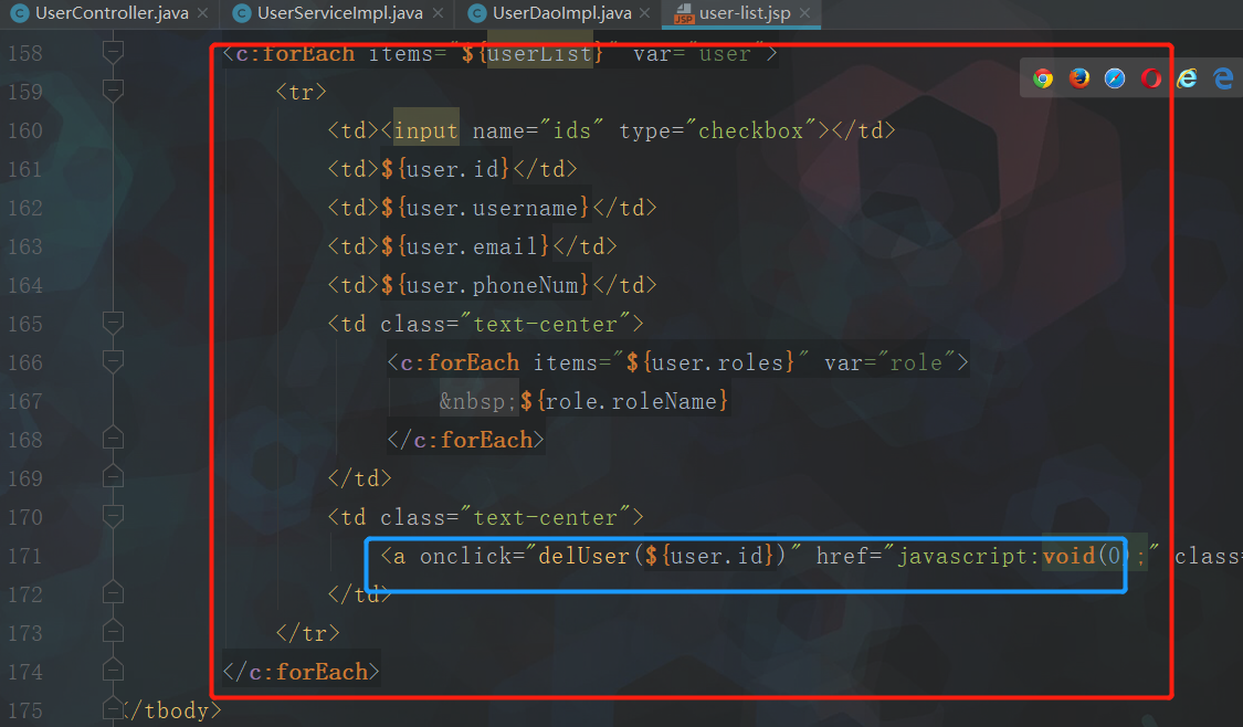 1 package com.haifei.controller; 2 3 import com.haifei.dao.UserDao; 4 import com.haifei.domain.Role; 5 import com.haifei.domain.User; 6 import com.haifei.service.RoleService; 7 import com.haifei.service.UserService; 8 import org.springframework.beans.factory.annotation.Autowired; 9 import org.springframework.stereotype.Controller; 10 import org.springframework.web.bind.annotation.PathVariable; 11 import org.springframework.web.bind.annotation.RequestMapping; 12 import org.springframework.web.servlet.ModelAndView; 13 14 import java.util.List; 15 16 @RequestMapping("/user") 17 @Controller 18 public class UserController { 19 20 @Autowired 21 private UserService userService; 22 23 @Autowired 24 private RoleService roleService; 25 26 @RequestMapping("/list") 27 public ModelAndView list(){ 28 ModelAndView modelAndView = new ModelAndView(); 29 List<User> userList = userService.list(); 30 modelAndView.addObject("userList", userList); 31 modelAndView.setViewName("user-list"); 32 return modelAndView; 33 } 34 35 @RequestMapping("/add") //saveUI 36 public ModelAndView add(){ 37 ModelAndView modelAndView = new ModelAndView(); 38 List<Role> roleList = roleService.list(); 39 modelAndView.addObject("roleList", roleList); 40 modelAndView.setViewName("user-add"); 41 return modelAndView; 42 } 43 44 @RequestMapping("/save") //save.do 45 public String save(User user, Long[] roleIds){ 46 userService.save(user, roleIds); 47 return "redirect:/user/list"; 48 } 49 50 @RequestMapping("/del/{userId}") //restful风格传参,参数占位 51 public String del(@PathVariable("userId") Long userId){ 52 userService.del(userId); 53 return "redirect:/user/list"; 54 } 55 56 }