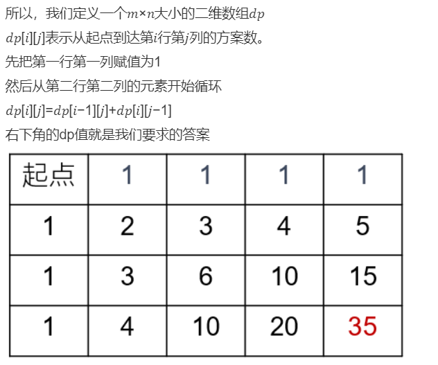 //参考1 public int uniquePaths (int m, int n) { int[][] dp = new int[m+1][n+1]; for(int i=1; i<=m; i++){ //第一列赋值为1 dp[i][1] = 1; } for(int j=1; j<=n; j++){ //第一行赋值为1 dp[1][j] = 1; } for(int i=2; i<=m; i++){ for(int j=2; j<=n; j++){ dp[i][j] = dp[i-1][j] + dp[i][j-1]; } } return dp[m][n]; }