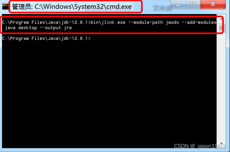 (1)运行上面生成JRE的命令的时候,CMD窗口路径显示的为: C:\Program Files\Java\jdk-12.0.1>: ,运行的命令为:bin\jlink.exe --module-path jmods --add-modules java.desktop --output jre,运行 的位置和路径一定要一致。