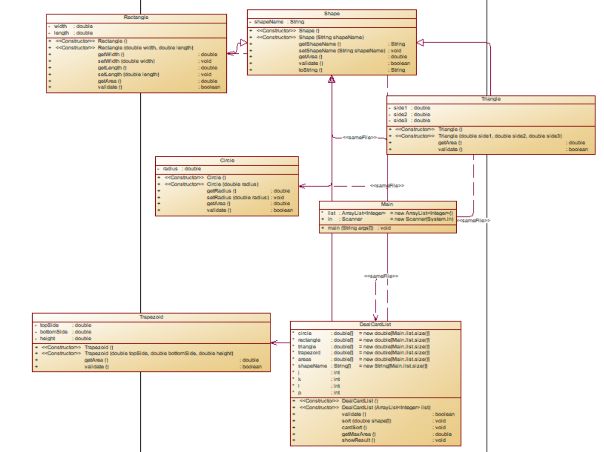 本题沿袭作业7-1,本次作业主要对卡片(Card)进行分组游戏,其规则为随机发放一些卡片给学生, 卡片仍然分为四种形状:圆形(Circle)、矩形(Rectangle)、三角形(Triangle)及梯形(Trapezoid), 并给出各种卡片的相应参数,要求学生首先根据卡片类型将所有卡片进行分组(一个类型分为一组, 所以最多四组),然后能够对每组内的卡片根据面积值从大到小进行排序,同时求出该组内所有卡片 的面积之和,最后求出每组卡片面积之和中的最大值。图形类设计可参考作业 7-1 的类层次结构(需要进一步完善),本次作业要求对卡片排序时使用 Comparable 接口或 Comparator 接口。