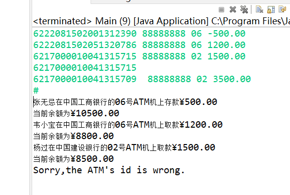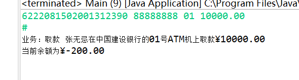 else { System.out.println("业务:取款 "+userName + "在" + bankName + "的" + ATMID + "号ATM机上取款" + String.format("¥%.2f", amount)); System.out.println("当前余额为" + String.format("¥%.2f", account.getBalance())); }