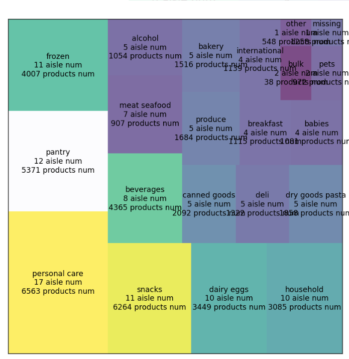 这段代码通过Pandas对多个数据表(产品、通道、部门)进行关联和聚合,最终生成一个按部门分组的统计表(`temp2`),其中包含每个部门的唯一商品数量和唯一通道数量。代码首先使用`pd.merge`将产品、通道和部门表按`aisle_id`和`department_id`左连接,确保数据完整性;随后提取关键字段(`product_name`、`aisle`、`department`),并按部门分组统计唯一值数量,生成两列指标(`products_department`和`aisle_department`)。最后,将部门设为索引并按通道数降序排序,为后续绘制板块层级图(Treemap)提供结构化数据,其中部门作为父类别,商品和通道数量分别决定矩形面积和颜色映射,直观展示层级与比例关系。