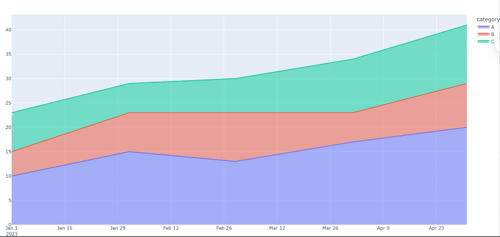 import plotly.express as px import pandas as pd # 示例数据 data = pd.DataFrame({ '时间': pd.date_range(start='2023-01-01', periods=12), 'A': [10, 12, 15, 18, 20, 17, 14, 12, 10, 8, 6, 4], 'B': [5, 7, 9, 11, 13, 15, 14, 12, 10, 8, 6, 4], 'C': [2, 3, 5, 7, 9, 10, 8, 6, 4, 3, 2, 1] }) # 绘制河流图 fig = px.area(data, x='时间', y=['A', 'B', 'C'], color_discrete_sequence=['#4CAF50', '#2196F3', '#FF5722'], title='多类别时间趋势河流图') fig.update_layout(yaxis_title='数值', xaxis_title='月份', legend_title='类别', hovermode='x unified') fig.show()