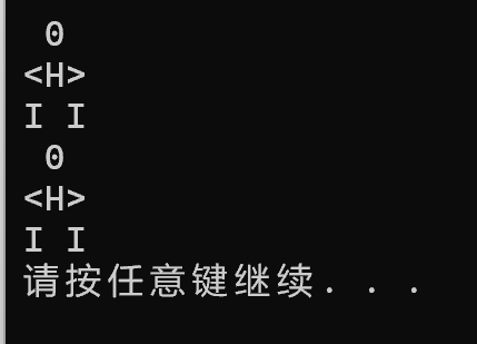 1 #include <stdio.h> 2 #include<stdlib.h> 3 int main() 4 { 5 printf(" 0 \n"); 6 printf("<H>\n"); 7 printf("I I\n"); 8 printf(" 0 \n"); 9 printf("<H>\n"); 10 printf("I I\n"); 11 12 system("pause"); 13 14 return 0; 15 }