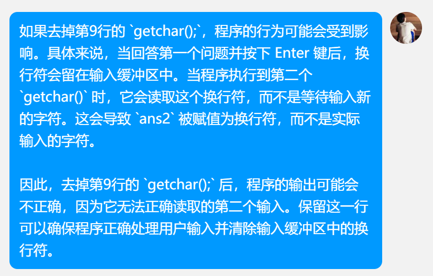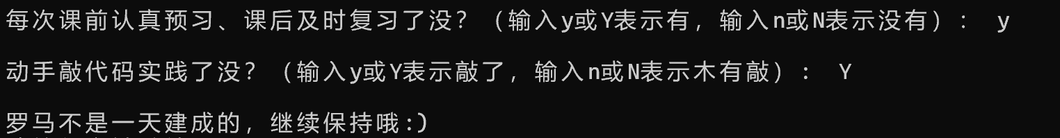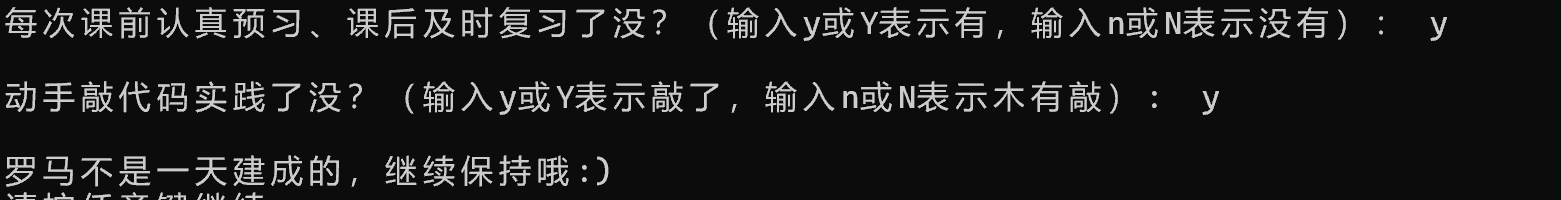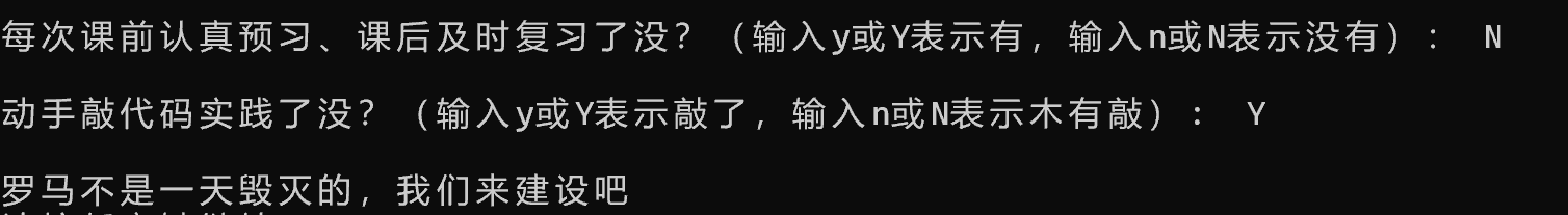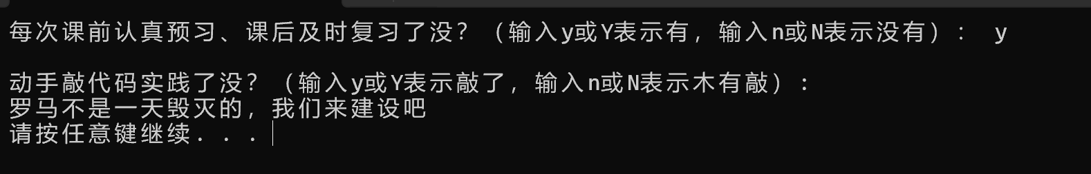 1 #include <stdio.h> 2 #include <stdlib.h> 3 int main() 4 { 5 char ans1, ans2; 6 7 printf("每次课前认真预习、课后及时复习了没?(输入y或Y表示有,输入n或N表示没有): "); 8 ans1 = getchar(); 9 10 getchar(); 11 12 printf("\n动手敲代码实践了没?(输入y或Y表示敲了,输入n或N表示木有敲): "); 13 ans2 = getchar(); 14 15 if((ans1 =='y' || ans1 == 'Y') && (ans2 == 'y' || ans2 == 'Y')) 16 printf("\n罗马不是一天建成的,继续保持哦:)\n"); 17 else 18 printf("\n罗马不是一天毁灭的,我们来建设吧\n"); 19 20 system("pause"); 21 22 return 0; 23 24 }