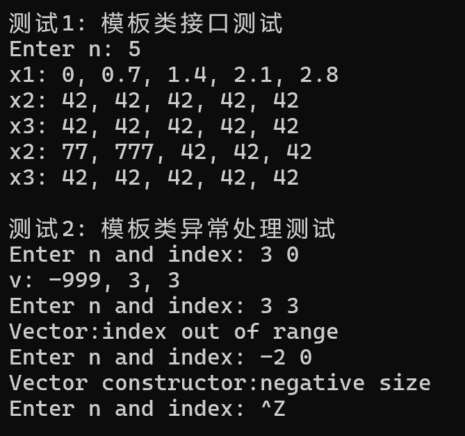 1 #include <iostream> 2 #include "Vector1.hpp" 3 4 void test1() { 5 using namespace std; 6 7 int n; 8 cout << "Enter n: "; 9 cin >> n; 10 11 Vector<double> x1(n); 12 for(auto i = 0; i < n; ++i) 13 x1.at(i) = i * 0.7; 14 15 cout << "x1: "; output(x1); 16 17 Vector<int> x2(n, 42); 18 const Vector<int> x3(x2); 19 20 cout << "x2: "; output(x2); 21 cout << "x3: "; output(x3); 22 23 x2.at(0) = 77; 24 x2.at(1) = 777; 25 cout << "x2: "; output(x2); 26 cout << "x3: "; output(x3); 27 } 28 29 void test2() { 30 using namespace std; 31 32 int n, index; 33 while(cout << "Enter n and index: ", cin >> n >> index) { 34 try { 35 Vector<int> v(n, n); 36 v.at(index) = -999; 37 cout << "v: "; output(v); 38 } 39 catch (const exception &e) { 40 cout << e.what() << endl; 41 } 42 } 43 } 44 45 int main() { 46 cout << "测试1: 模板类接口测试\n"; 47 test1(); 48 49 cout << "\n测试2: 模板类异常处理测试\n"; 50 test2(); 51 }