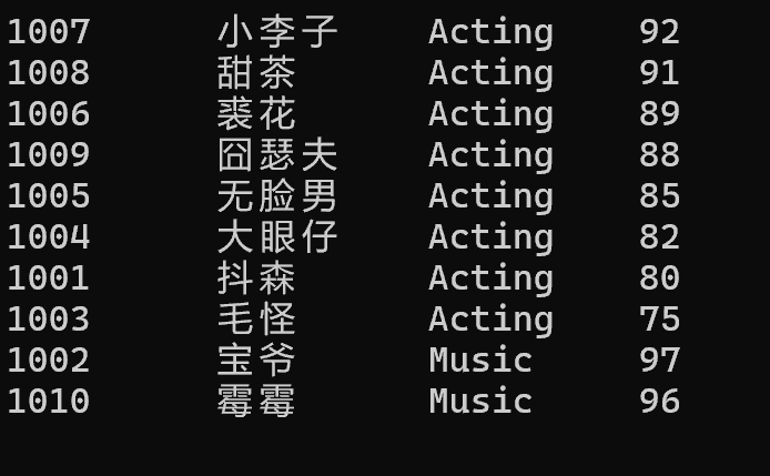 1 #include"information.hpp" 2 #include"tools.hpp" 3 #include<string> 4 #include<vector> 5 #include<algorithm> 6 #include<iostream> 7 8 int main() 9 { 10 vector<information> v; 11 load("data5.txt", v); 12 sort(v.begin(), v.end(), paixu); 13 output(cout, v); 14 save("ans.txt", v); 15 return 0; 16 }