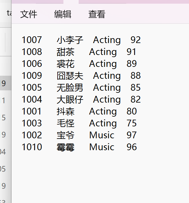 1 #pragma once 2 #include"information.hpp" 3 #include<iostream> 4 #include<string> 5 #include<fstream> 6 #include<vector> 7 8 bool paixu(const information& p1, const information& p2) 9 { 10 if (p1.get_major() == p2.get_major()){ 11 return p1.get_score() > p2.get_score(); 12 } 13 if (p1.get_major() < p2.get_major()){ 14 return true; 15 } 16 return false; 17 } 18 19 void output(ostream& out, const vector<information>& v) 20 { 21 for (auto& i : v){ 22 out << i; 23 } 24 } 25 26 void save(const string& filename, vector<information>& v) 27 { 28 ofstream out(filename); 29 if (!out.is_open()) 30 { 31 cout << "文件写入失败" << endl; 32 exit(0); 33 } 34 output(out, v); 35 out.close(); 36 } 37 38 void load(const string& filename, vector<information>& v) 39 { 40 string firstline; 41 information p; 42 ifstream in(filename); 43 if (!in.is_open()){ 44 cout << "文件读出失败" << endl; 45 exit(0); 46 } 47 48 getline(in, firstline); 49 while (in >> p){ 50 v.push_back(p); 51 } 52 53 in.close(); 54 }
