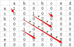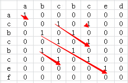 分析:a[i][j]表示两个字符串的第i位和第j位上连续匹配的字符个数,如果i和j不匹配,a[i][j]为0,匹配则在a[i-1][j-1]的基础上加1。把两个字符串分别以行列组成一个二维矩阵,比如str=acbcbcef,str2=abcbced,我们可以得到下面的矩阵,比较二维矩阵每个点对应行列是否相等,相等设为1否则为0,查找出值为1的最长对角线长度就能得到最长公共子串。