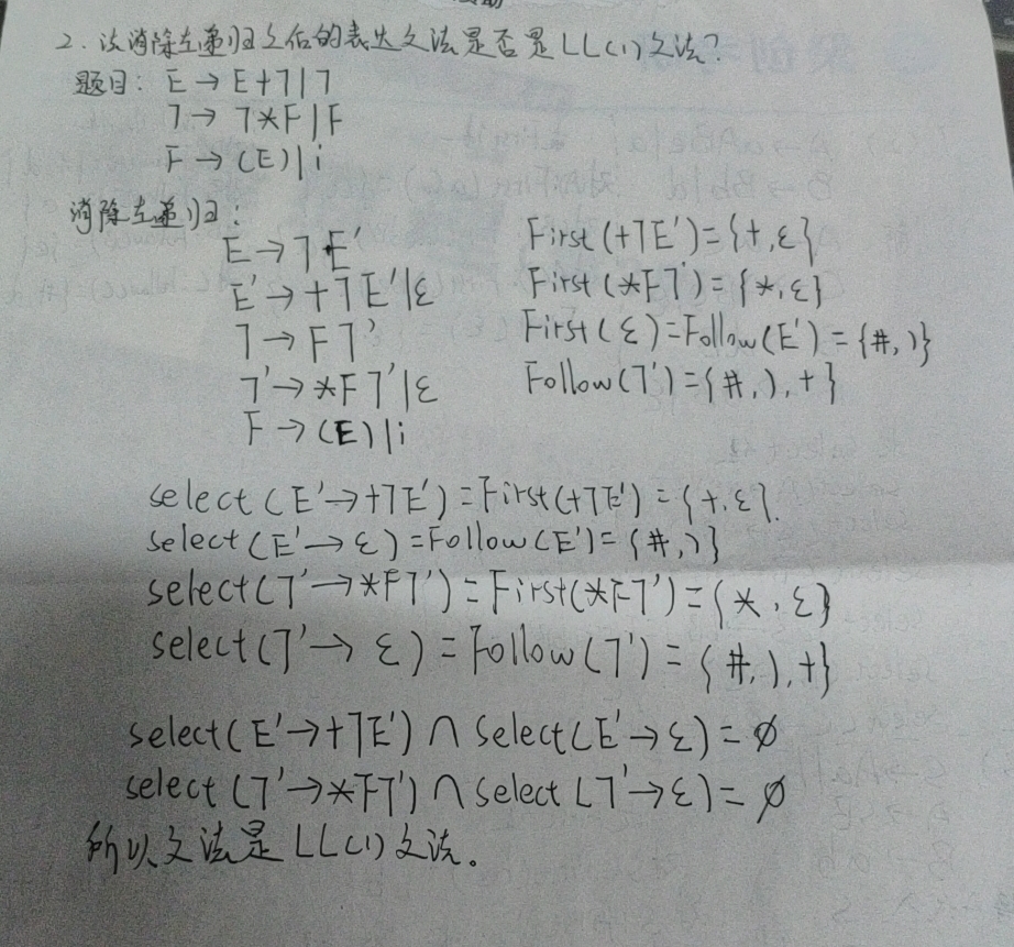 2.法消除左递归之后的表达式文法是否是LL(1)文法?