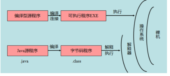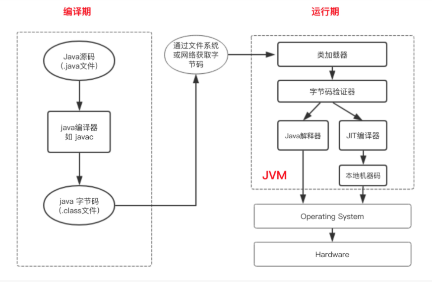 - java文件通过编译器成为字节码,字节码传入jvm,类装载器装载字节码中的类,字节码校验器完成校验确认后通过解释器传输给操作系统,操作系统运行。