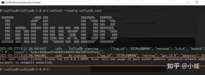 InfluxDB 使用时需要首先打开 Influxd.exe,直接打开会使用默认配置,需要使用已配置的配置文件的话,需要指定 conf 文件进行启动,启动命令:influxd --config influxdb.conf