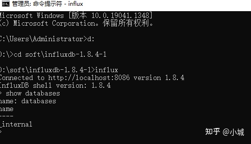 启动 influxd 后,窗口不要关闭。再启动一个 cmd 窗口,执行如下命令:influx