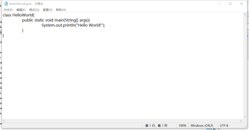 (1)在JDK的bin目录下新建HelloWorld.java并使用记事本打开