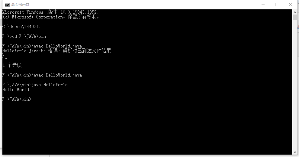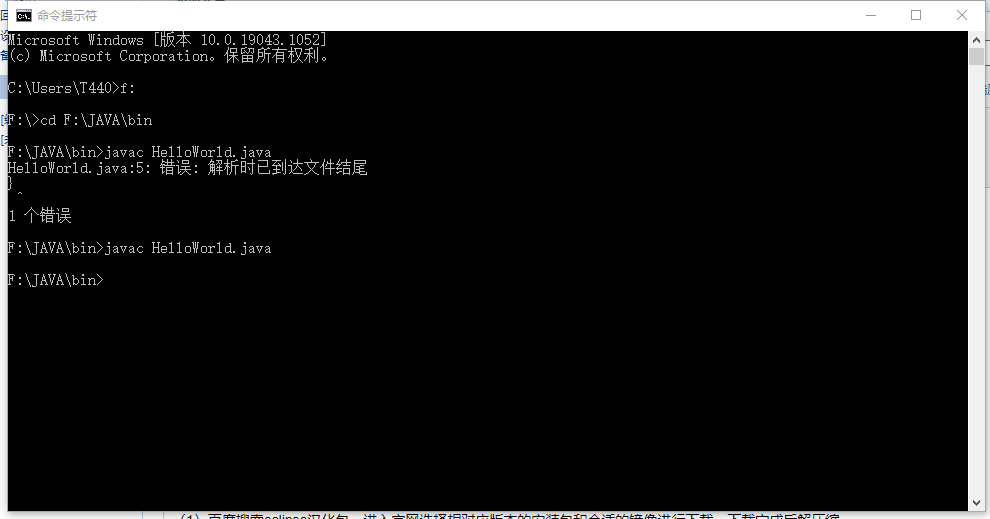 2.在使用javac命令编译时出现提示:“解析时已到达文件结尾”。