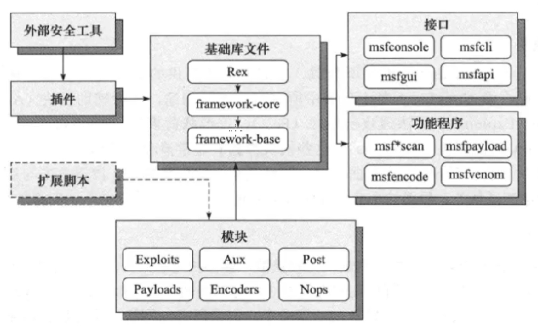 2、接口:msfconsole控制终端、msfcli命令行、msfgui图形化界面、armitage图形化界面以及msfapi远程调用接口。