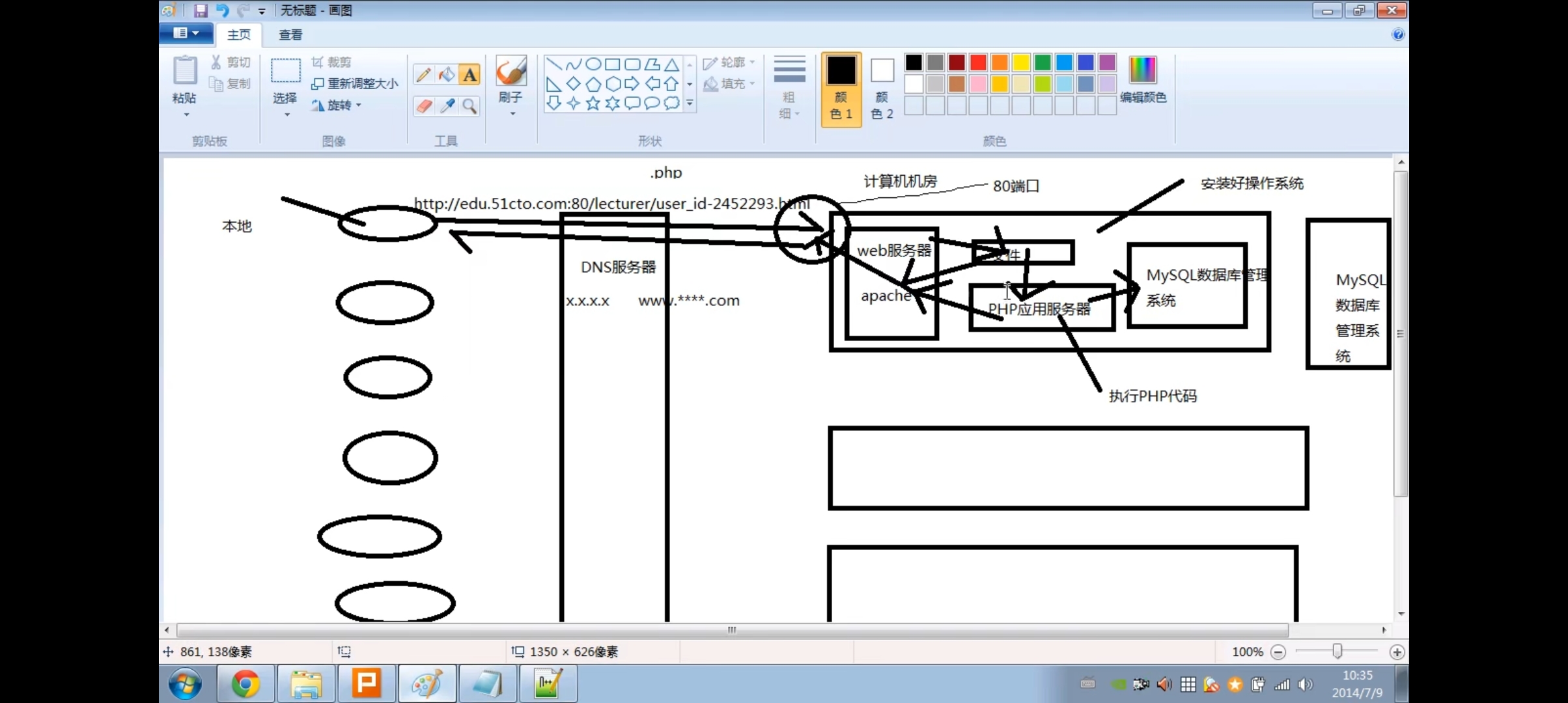 本机请求访问文件,要通过DNS服务器(域名服务器)传到web服务器(服务器是软件不是硬件)(我们用的是apache)web服务器再回传文件,若是PHP文件还需要web将文件传给PHP应用服务器,执行PHP代码,再由他传给web服务器。这些文件都存在MySQL数据库管理系统。
