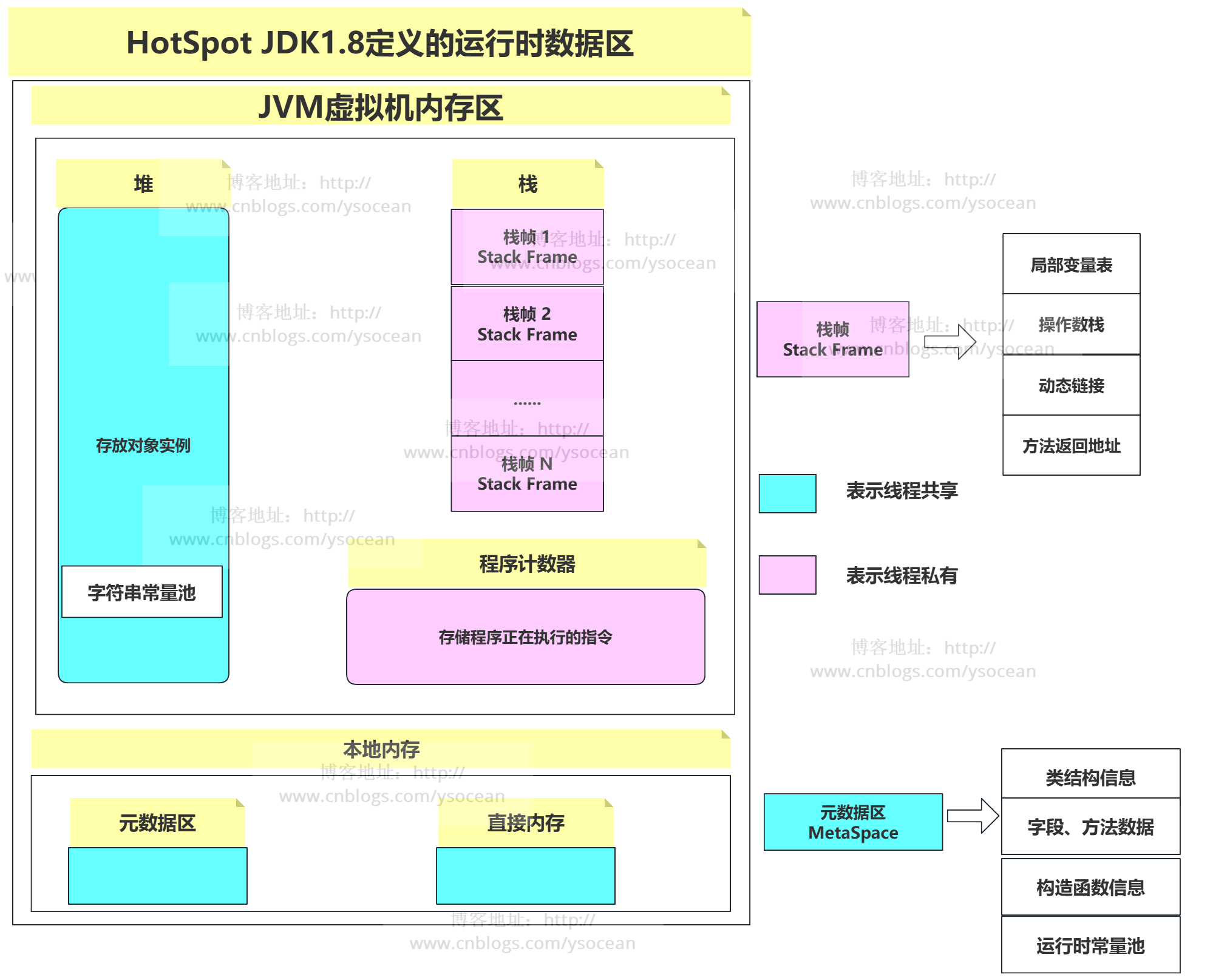 PS:下面介绍的是根据 Java虚拟机规范 定义的运行时数据区,上一篇博客我们讲过根据虚拟机规范实现的虚拟机有很多个,而不同的虚拟机其运行时数据区定义也会有所不同。比如默认的 HotSpot 在实现 JDK1.7 虚拟机规范时,其常量池的定义不在方法区中,而是移到了堆中;到了 HotSpot JDK1.8 中,则彻底移除了持久代(方法区)而使用Metaspace(元数据区)来进行替代等等,关于这些区别本篇博客也会在文章末尾进行相应的说明。