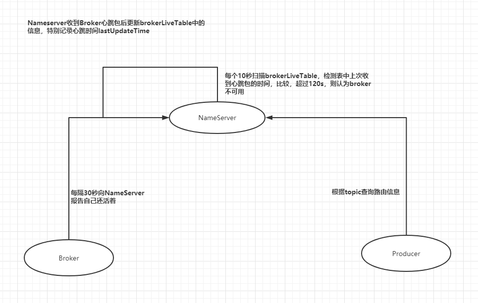 Broker每个30秒向NameServer发送一个心跳包,心跳包中包含BrokerId、Broker地址、Broker名称、Broker所属集群名称、Broker关联的FilterServer列表。