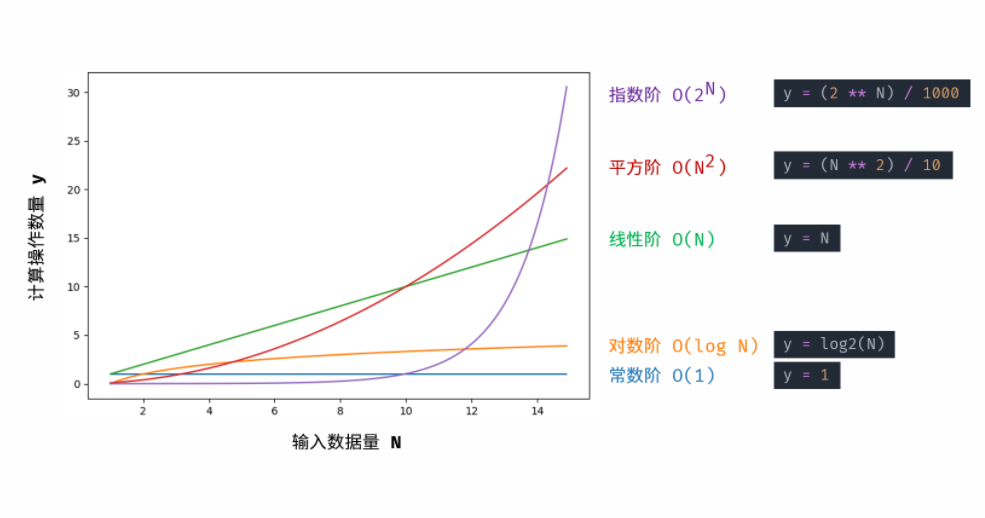 总结:由下图可以看出,不同时间复杂度随着时间的推移,差距会越来越大。所以当算法优化一点,在高并发情况下,收益会非常大。