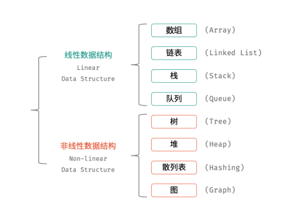 常见的数据结构包括:线性数据结构、非线性数据结构。具体为:数组、链表、栈、队列、树、图、散列表、堆