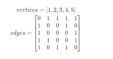 - 边集合:edges = {(1,2),(1,3),(1,4),(1,5),(2,4),(3,5),(4,5)}