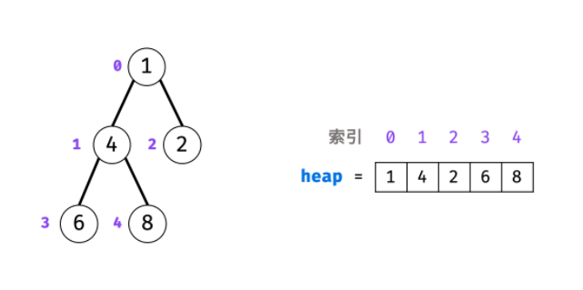 如下图所示:包含1、4、2、6、8元素的小顶堆。将堆(完全二叉树)中的节点按层编号,即可映射到右边数组存储形式。