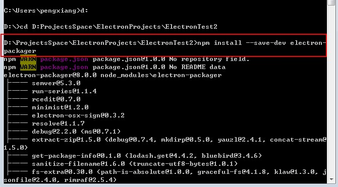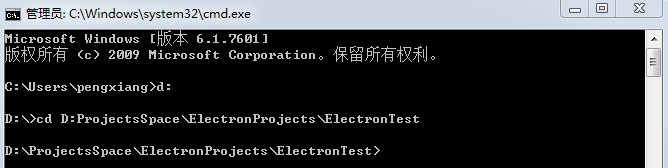 1、首先,切换到你的项目空间,我的在 D:\ProjectsSpace\ElectronProjects\ElectronTest,ElectronTest是案例项目文件夹