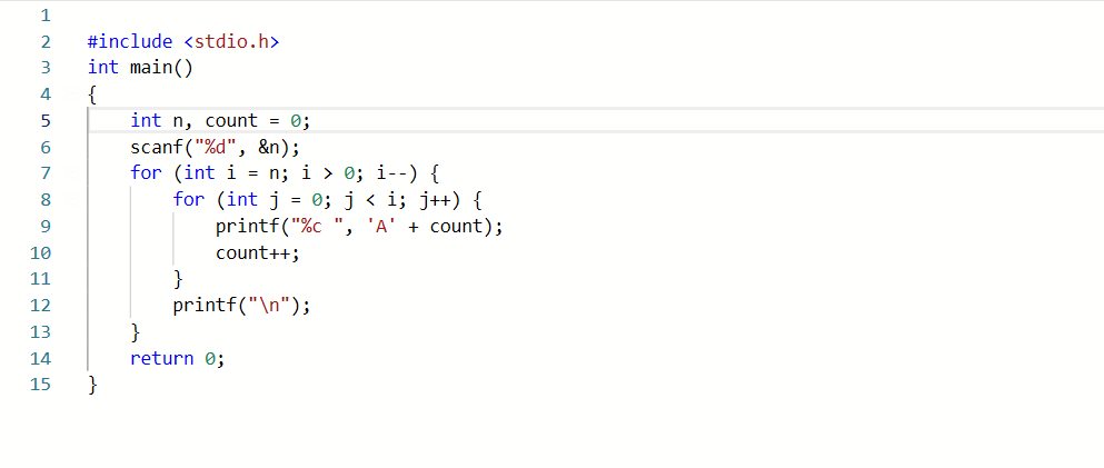 定义了n来表示输出的行数;count用来表示字母的累加;