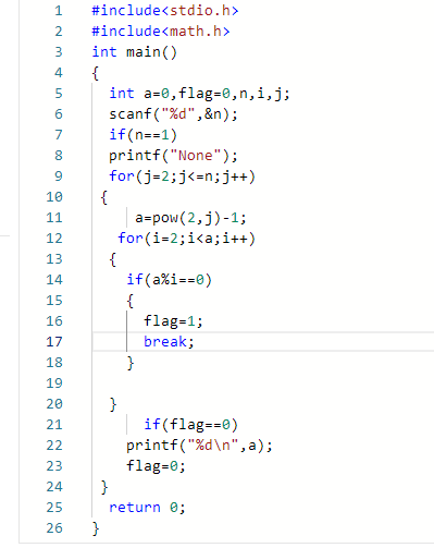 按从小到大的顺序输出所有不超过2n−1的梅森数,每行一个。如果完全没有,则输出“None”。