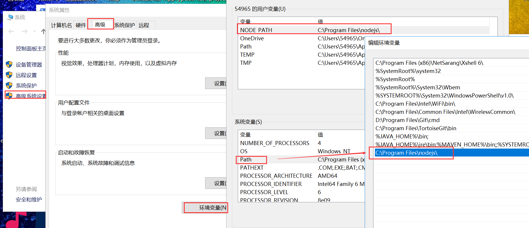 windows系统里, 需要把nodejs安装目录路径设置进系统变量或用户变量