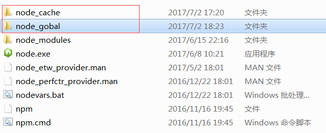 1.下面我们来进行npm全局模块的存放路径以及cache的路径的配置,这些路径默认是在 C 盘的,我觉得这样会增加系统盘的负担,所以我希望将以上两个文件放在nodejs的主目录下,因此我在nodejs目录下也就是我的安装目录下建立了”node_gobal”和”node_cache”两个文件夹,如下图: