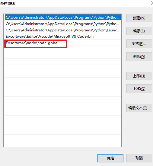 npm config set prefix "E:\node\node_gobal" npm config set cache "E:\node\node_cache"