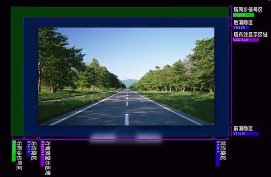 并且显示器在扫描的时候除了要保证扫描线的对齐还需要保证画面实在屏幕的正中心,所以显示器在逐行扫描的时候会在屏幕的外面预留一些区域用于对齐和时钟同步。所以你看到的屏幕虽然是1920X1080,但实际上屏幕扫描的区域要远比这个区域大得多,虽然额外多出来的这些像素点不参与你屏幕内容的显示,但是它还是会占用你的传输带宽因此我们在计算显示器带宽的时候需要把多的这一部分也考虑进去,前面提到的错误带宽2.986Gbt/s就是因为没有考虑到这些同步信号所以才会是错的,显示器实际扫描的区域分为三个部分:同步信号区(Sync)、消隐区(Blank)、有效显示区(Active)。