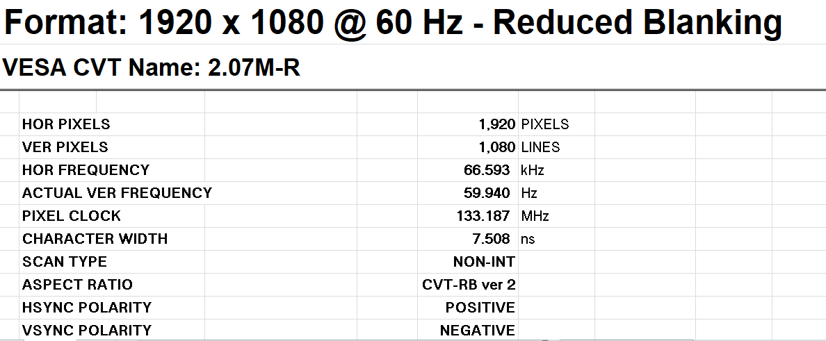 在表格中输入1920X1080和60Hz的刷新率后表格会自动算出所有有关这个分辨率和刷新率在CVT-R2中的相关信息,其中PIXEL CLOCK也就是像素时钟是133.187MHz,那么我们就应该用133.187X8X3最后约等于3.196Gbit/s,这样计算出来的显示器带宽才是正确的。