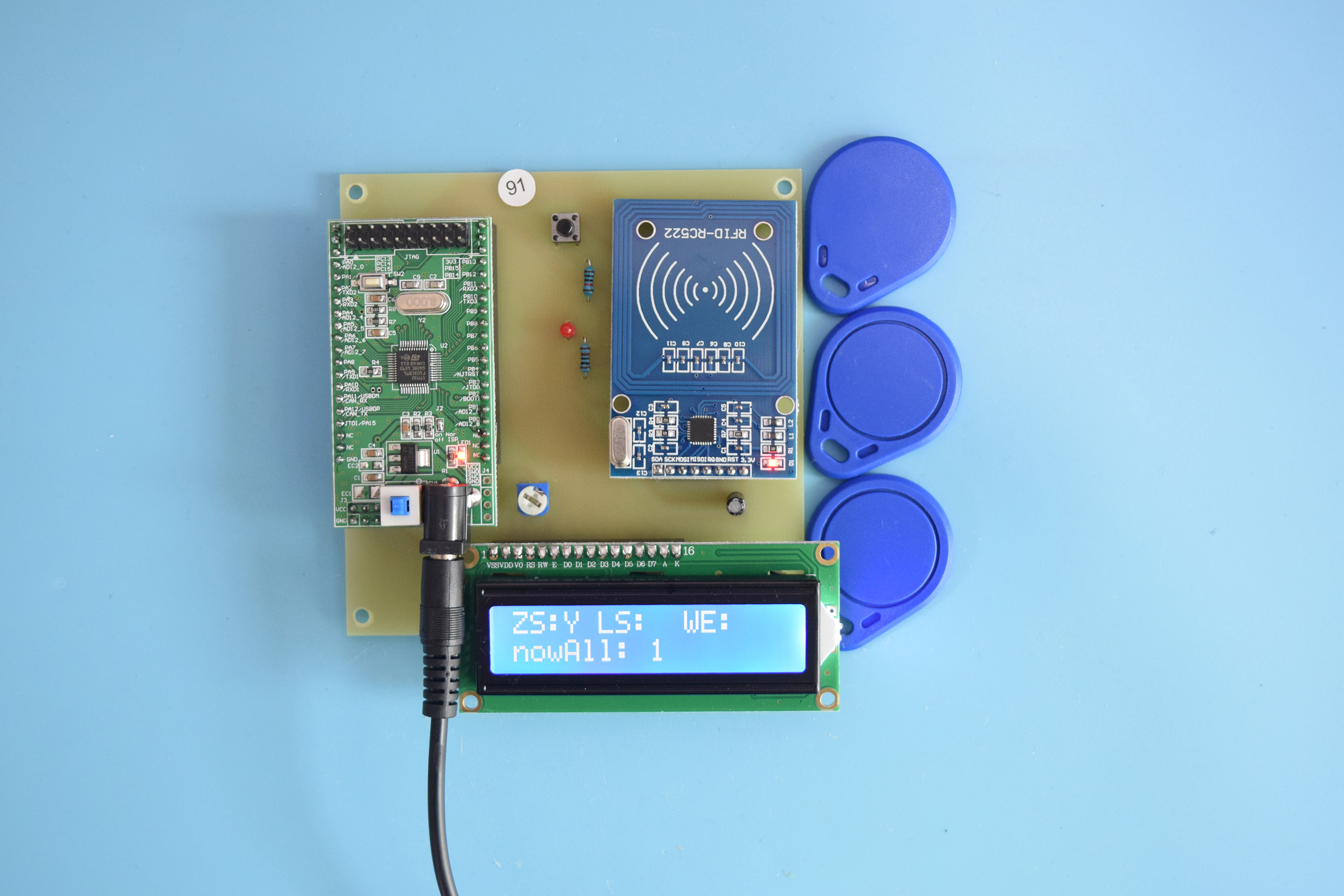 本系统由STM32F103C8T6单片机核心板、RFID模块、LCD1602液晶显示、按键、LED报警组成。