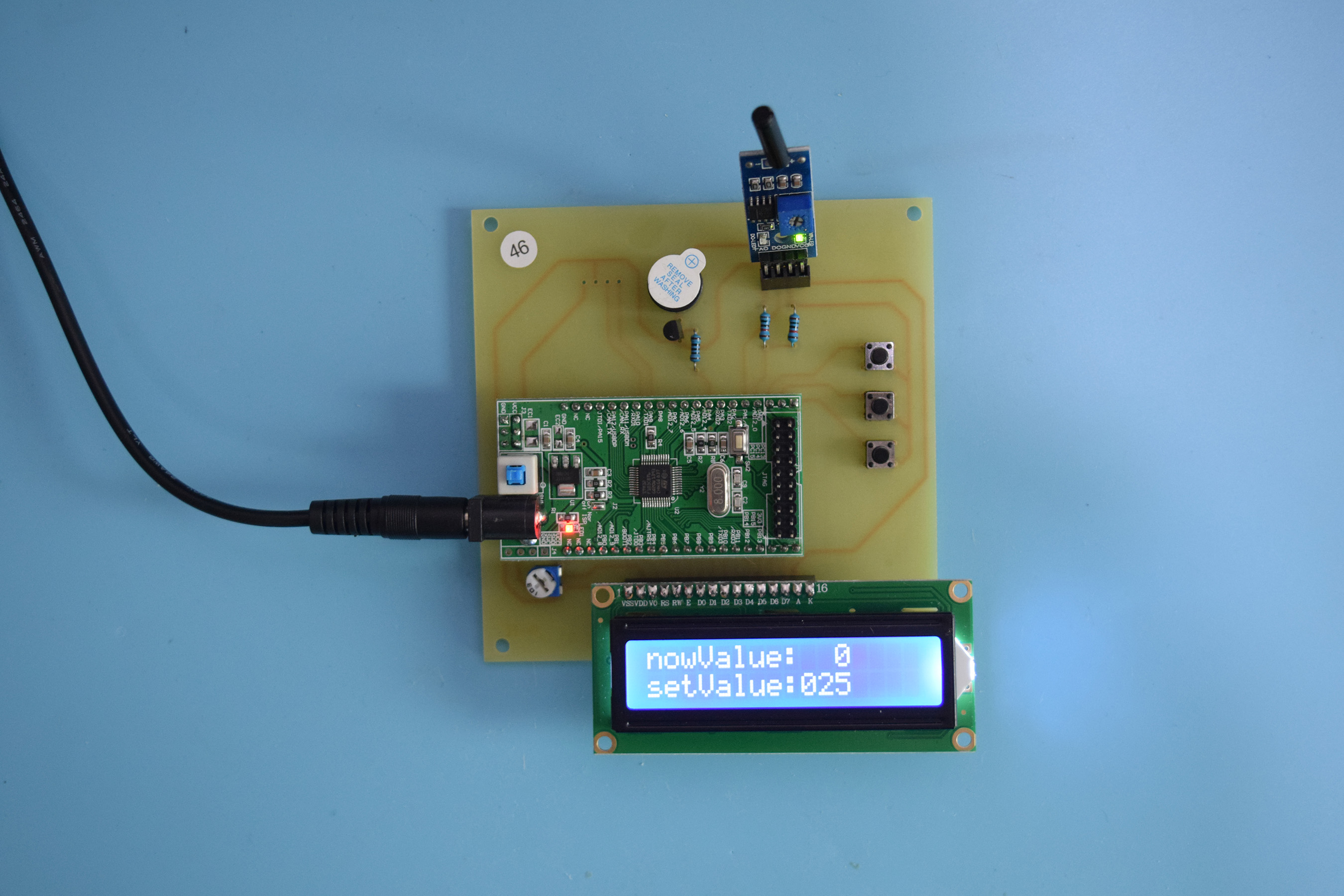 本系统由STM32F103C8T6单片机核心板、震动传感器、LCD1602液晶显示、