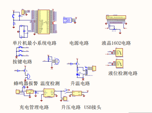 本设计由STC89C52单片机电路+防水型数字温度传感器DS18B20电路+按键电路+蜂鸣器报警电路+继电器控制电路+LCD1602液晶显示电路+液位检测电路+电源电路组成。