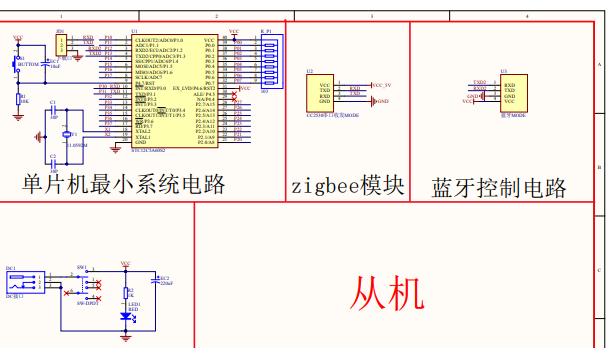 从机由STC12C5A60S2单片机电路+ZigBee模块电路+蓝牙模块电路+电源电路组成。