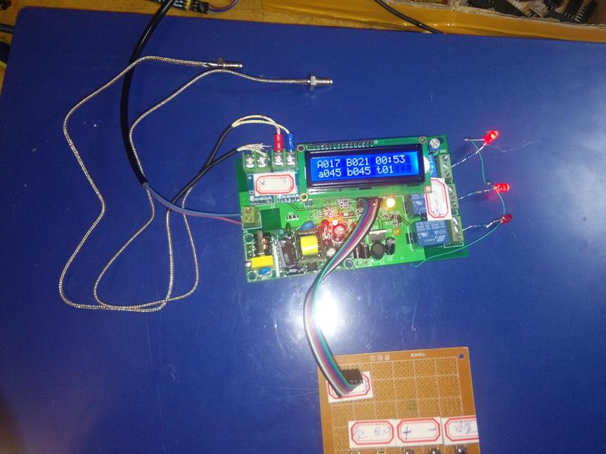 5、系统设置好后,按下启动按键,这2路加热继电器将按照第3点功能开始工作,工作时间为第4点设定的时间,时间到后,2路加热继电器全部断开,同时风扇继电器开始闭合,当2路热电偶检测到的温度均低于45℃时,风扇继电器断开,同时蜂鸣器报警10秒,然后停止鸣叫,液晶显示待机状态。自此整个周期结束,除非再次按下启动按键。