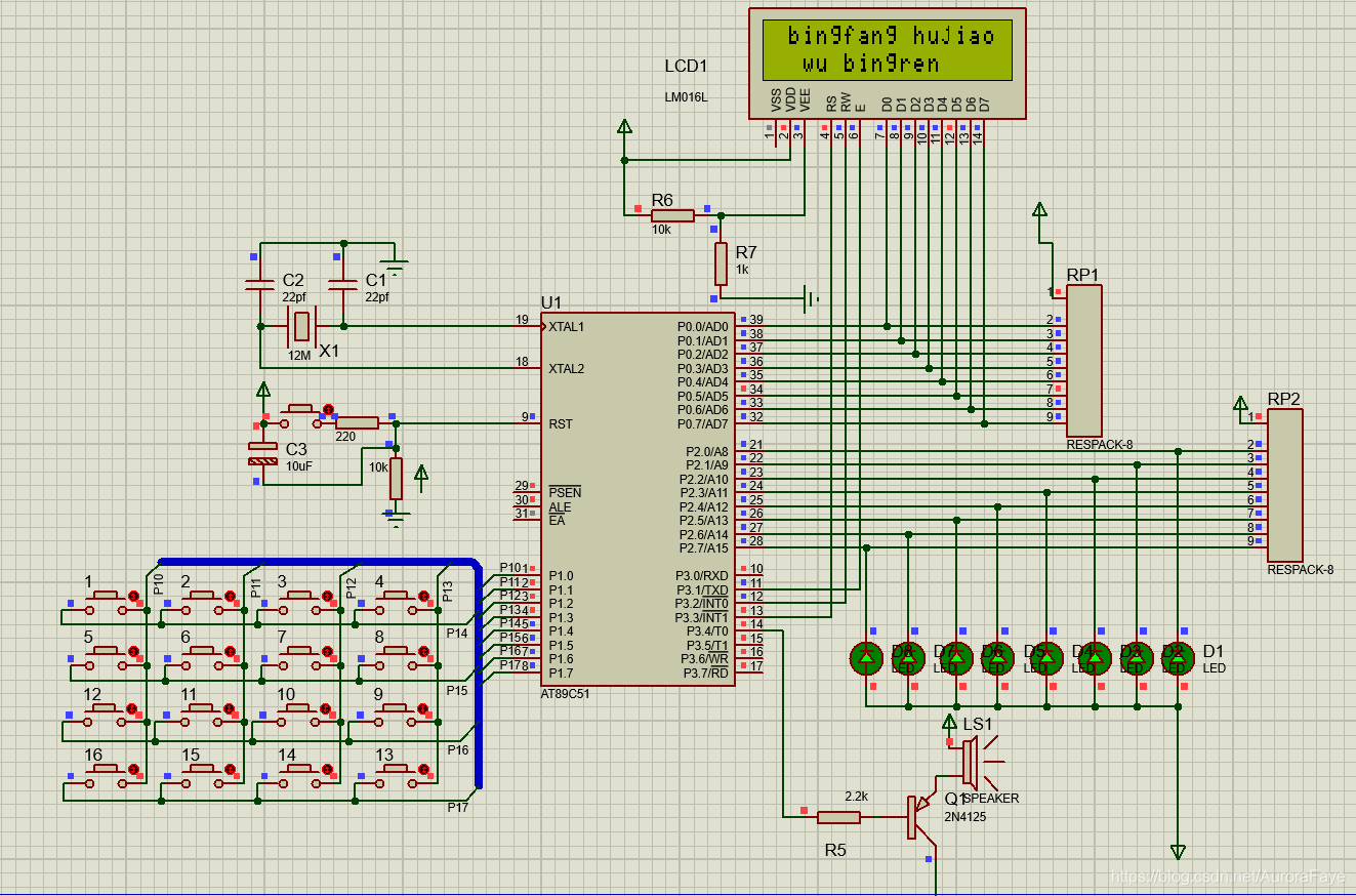 鸣器响3.八个按键对应八个灯,其中灯按下表示压力,对应的床即有人。3、另外八个按键对应呼