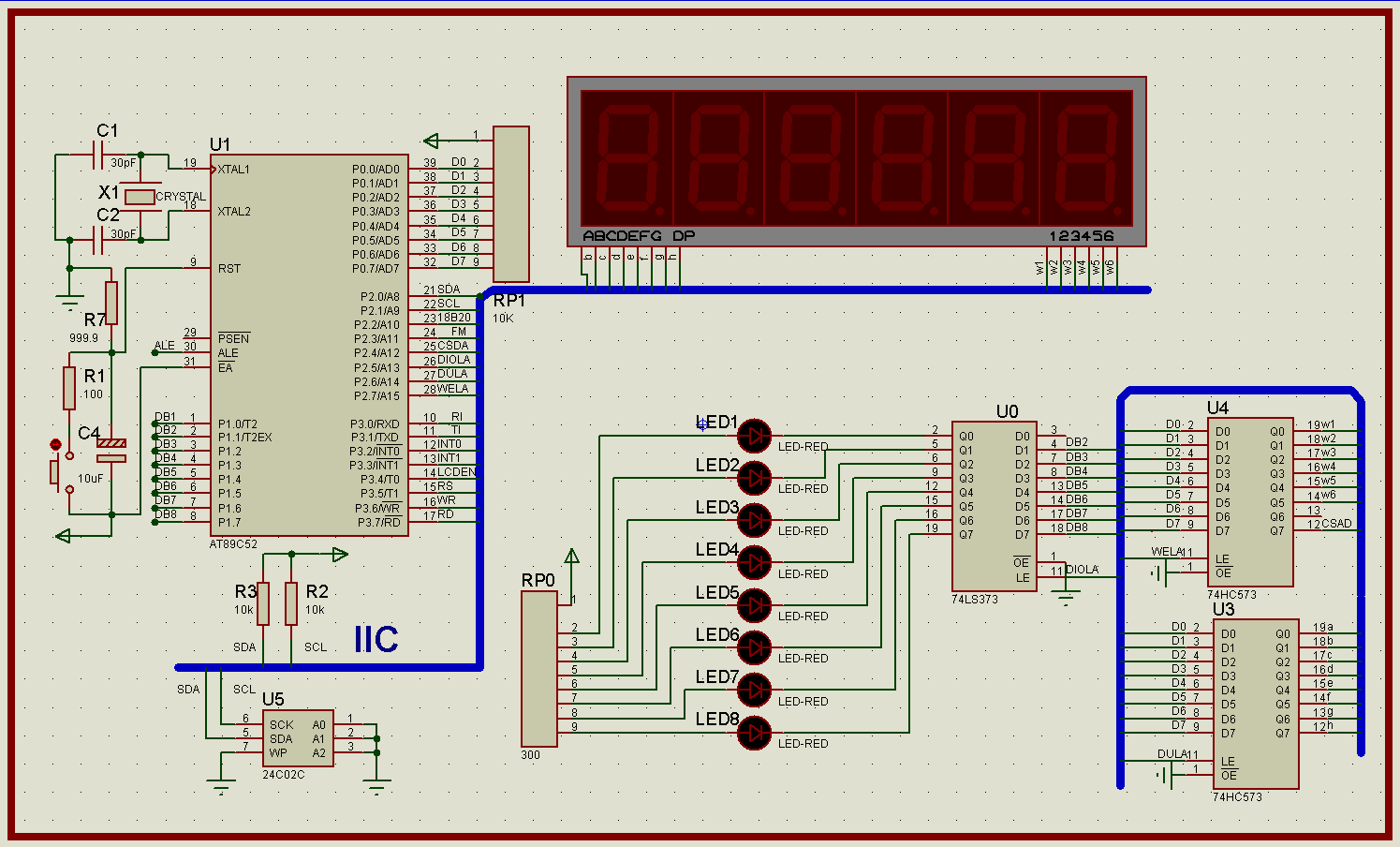 在这个实验中,数码管的读数是经过IIC总线,从型号为24C02C的EPROM中读取出来的,该数字每累加一次,也会把累加后的数值保存到24C02C中,当单片机复位或断电时,该数值就不会丢失,当复位后或再上电时,数码管就能显示刚才的读数并在此基础上继续累加下去。