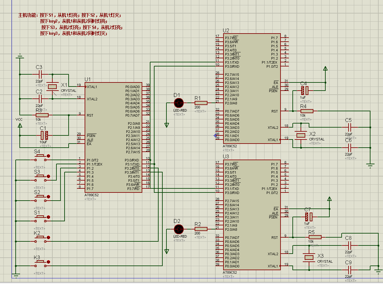 主机功能:按下S1,从机1灯亮;按下S2,从机1灯灭;