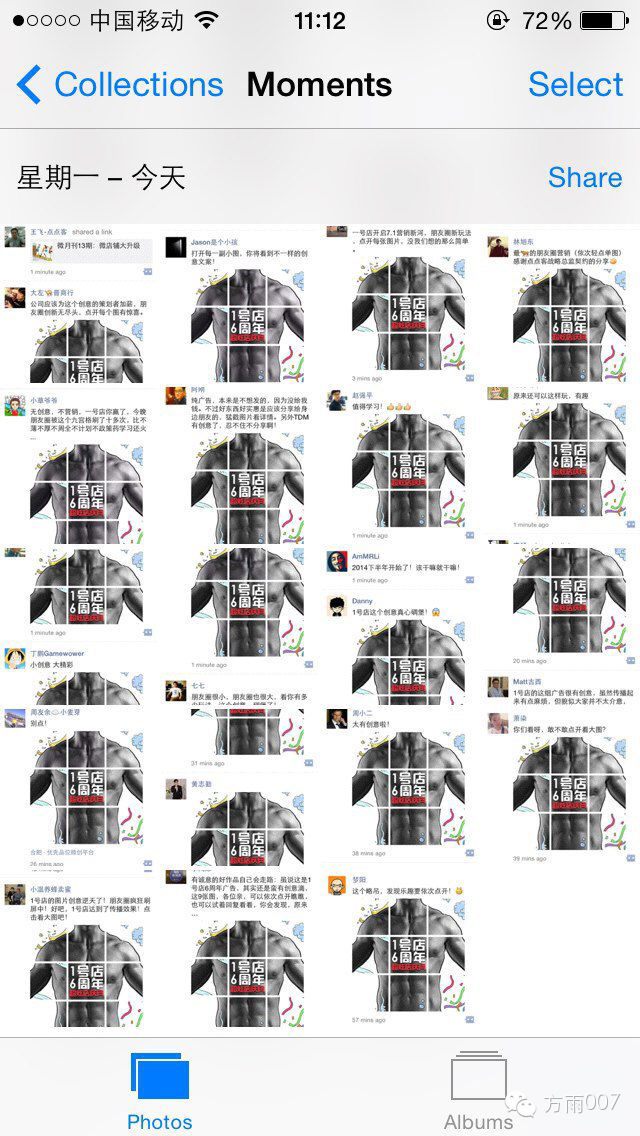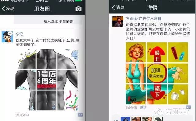 看 到这里会不会恍然大悟?方雨个人觉得1号店这次的活动有独创的新意,玩别人没想到的东西,把朋友圈每次可以最多上传九张图,并且把每张图片像素、每张图的 组合琢磨得很细致,把九张图片组合成诱人的图案,诱发用户的兴趣和好奇,逐张点开来看,才发现是广告,拍案叫绝中记住了广告信息,还主动下载转发到自己的 朋友圈,达到了病毒式传播的目的真的是玩到了极致!用户明知是广告还主动帮忙传播!玩微信一定要玩人无我有的东西,一号店这次推广可以说是很典型的案例。